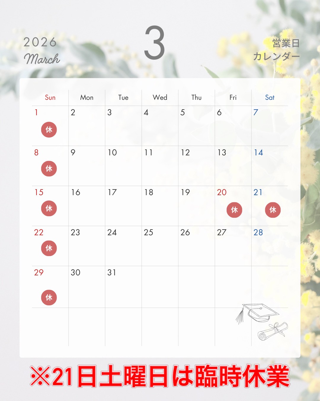 3月の営業日 2026年3月2日 あっという間に3月です!! スタッドレスからの履き替え始まっています。 交換の予約お待ちしております!! 3月は20日祝日に続き、21日土曜日を臨時休業とさせて頂きます(^^)/